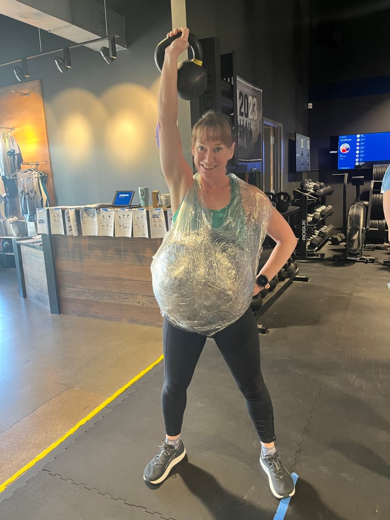 I recently showed up to my gym for what I thought was a regular class, only to find out it was a pregancy inspired workout in honor of one of our pregnant classmates. So we all strapped on wallballs (mine weighed 14 pounds) and proceeded to do a variety of sprints, pullups and kettlebell swings.